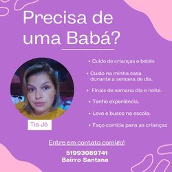 Cuido de crianças de 6 messes até 10 anos em minha casa. Tenho anos de experiência e referências,cuido de crianças com necessidades especiais,assim como cuido de idosos em hospitais e também no seu lar,com anos de experiência também, possuo experiência em cuidados de acamados,com sonda,no pós operatório,e curativos,tenho curso de primeiros socorros, aferição de pressão arterial,e administração de remédios também.