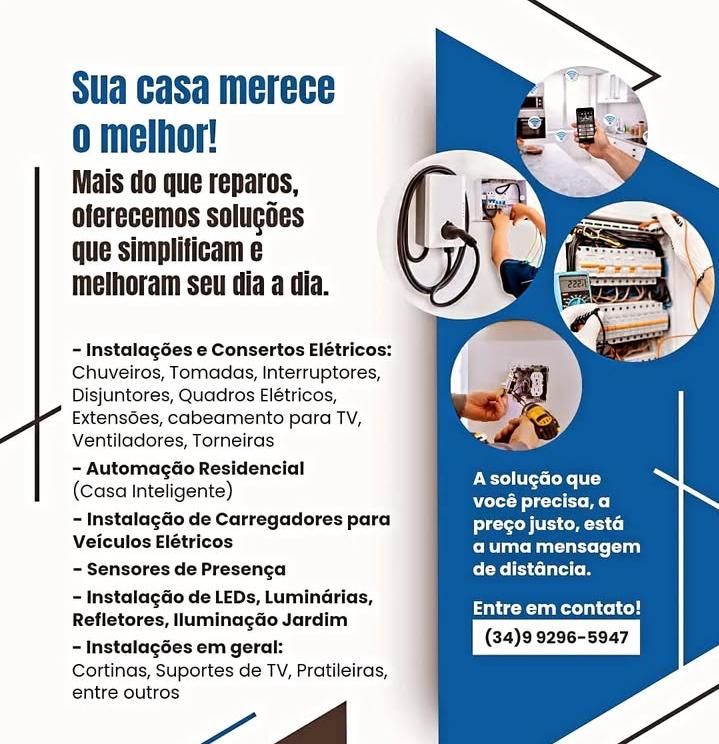 ELÉTRICA 🪛 ● Chuveiro ● Tomadas e Extensão ● Interruptores ● Luminárias ● Disjuntores ● Conversão de tomadas 110v para 220v ● Ventiladores HIDRÁULICA 🔧 ● Torneiras ● Sifão ● Registros ● Etc Soldagem ⛏️ ● Reparos em portões ● grades ● Portas ● Churrasqueiras ● Solda em geral Serviços Diversos 🧰 ● Suporte de TV ● Acessórios de Cozinha ● Suporte de Plantas ● Varal de Parede ● Cortinas ● Prateleiras ● Painéis de TV ● Mangueira de fogão ● Acessórios de Banheiro ● Quadros ● Espelhos