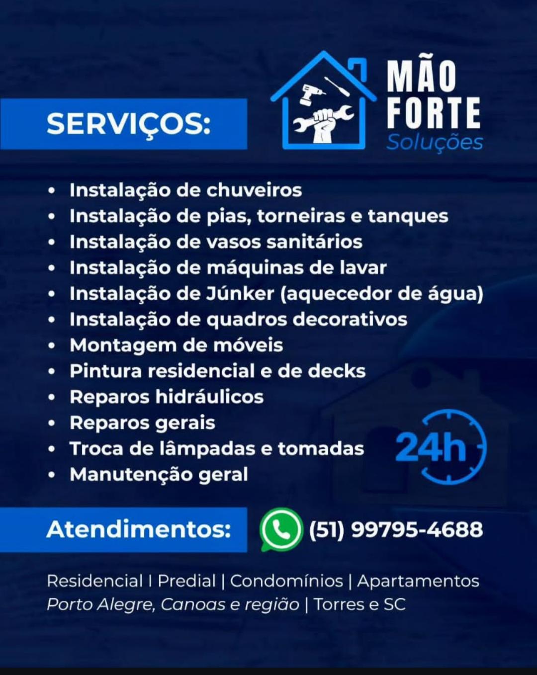 Mão Forte Soluções! A Mão Forte Soluções é especializada em manutenção residencial e predial, oferecendo serviços rápidos, seguros e de qualidade para residências, apartamentos, condomínios e empresas. Trabalhamos com instalações, reparos e manutenção geral, incluindo: chuveiros, pias, torneiras, tanques, vasos sanitários, máquinas de lavar, aquecedores (Junker), montagem de móveis, instalação de quadros, pintura residencial e de decks, reparos hidráulicos, troca de lâmpadas e tomadas, além de reparos gerais. ⏱ Atendimento 24 horas 📍 Atendemos, Torres, Passo de Torres, Canoas e Regiãoz e todo litoral gaúcho!