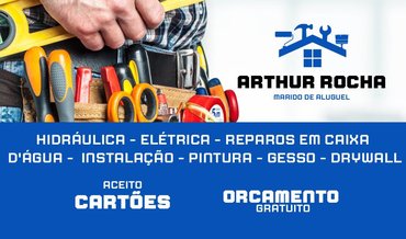 Arthur Rocha - Soluções e Serviços Atua na área de Elétrica, Hidraulica, Pintura, Drywall e pequenos reparos, realizamos instalações e manutenções, tanto residênciais, prediais quanto comerciais. Elétrica: Chuveiros, Disjuntores, Fiação, Perfil de Led, Ventiladores, Iluminação, Tomadas, Quadros de Distribuição, Torneiras Elétricas, etc Hidráulica: Torneiras, Tubulações, Bombas de Água, Registros, Vasos Sanitários, Caixas de Água, etc Pintura: Interna, Externa, Aberturas, Grades, etc Drywall: Instalação e reformas, pinturas, etc Nosso Contato: Whats 53999986614
