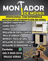 *SERVIÇO DE QUALIDADE E SEM STRESSE!* Pontualidade e organização, prezando sempre pelo melhor atendimento. Preços competitivos e qualidade excepcional. Montagem reforçada e caprichada. Serviço limpo e organizado. Orçamento rápido e sem complicação. *MONTAGEM DE MÓVEIS:* Montagem e remontagem de móveis com precisão e cuidado. Seja para móveis novos ou para aqueles que já passaram por desmontagens. *DESMONTAGEM PARA MUDANÇAS:* Realizo a desmontagem de seus móveis com o máximo cuidado e precisão, assegurando a preservação de todas as peças para montagens futuras. *INSTALAÇÕES EM GERAL:* Instalação de painéis de tv, nichos, cortinas, persianas e suportes em geral. Por que contratar um Montador de Móveis Profissional? A montagem de móveis, especialmente aqueles que vêm desmontados, como guarda-roupas, racks e estantes, pode ser uma tarefa complexa e demorada. Um montador de móveis qualificado traz conhecimento técnico e cuidado na montagem e desmontagem de cada peça, garantindo que o móvel fique perfeito e seguro para o uso diário. Mais informações clique no link:⚡https://wa.me/5586999490316