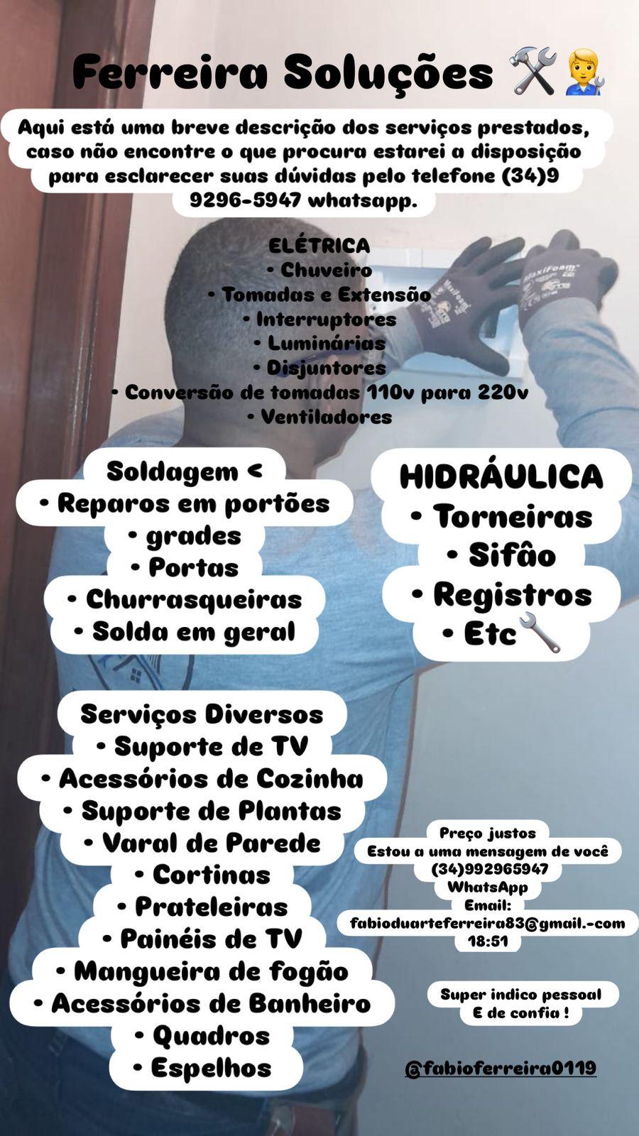 ELÉTRICA 🪛 ● Chuveiro ● Tomadas e Extensão ● Interruptores ● Luminárias ● Disjuntores ● Conversão de tomadas 110v para 220v ● Ventiladores HIDRÁULICA 🔧 ● Torneiras ● Sifão ● Registros ● Etc Soldagem ⛏️ ● Reparos em portões ● grades ● Portas ● Churrasqueiras ● Solda em geral Serviços Diversos 🧰 ● Suporte de TV ● Acessórios de Cozinha ● Suporte de Plantas ● Varal de Parede ● Cortinas ● Prateleiras ● Painéis de TV ● Mangueira de fogão ● Acessórios de Banheiro ● Quadros ● Espelhos