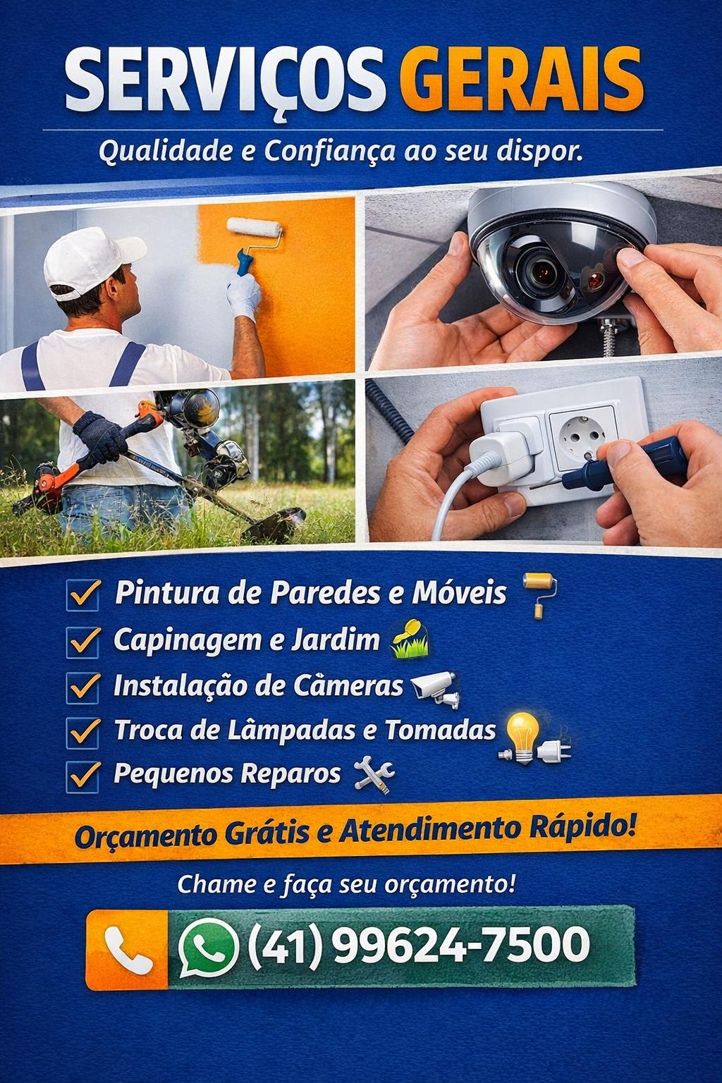 Profissional autônomo especializado em serviços de pintura em geral, incluindo pintura de paredes internas e externas, portas, portões e móveis. Realizo também serviços de capinagem e manutenção de áreas externas, instalação de câmeras de segurança, troca de lâmpadas, tomadas e pequenos reparos elétricos residenciais. Atendimento com responsabilidade, pontualidade e compromisso com a qualidade. Orçamento sem compromisso.