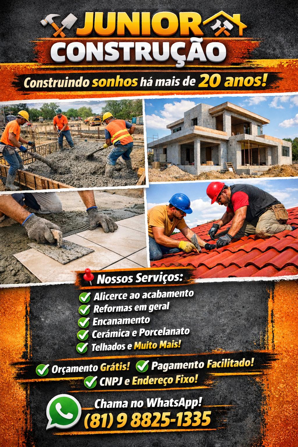 Somos uma empresa de construção com mais de 20 anos de experiência, temos trabalhadores qualificados que entregam mais que o esperado! serviços que fazemos: reformas hidráulica impermeabilização telhados construção do zero demolição porcelanatos cerâmicas portas e janelas e muito mais! nosso Instagram: @juniorconstrucao_ nosso contato: (81) 9 8825-1335 orçamento grátis!