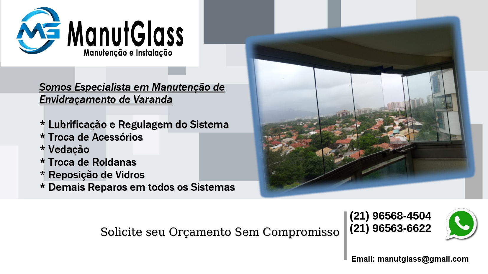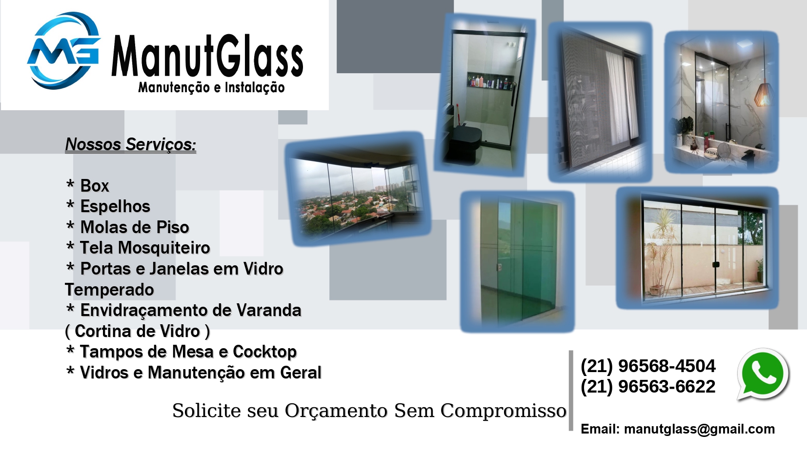 Manutenção e Instalação em: - Box - Janelas e Portas - Envidraçamento de sacadas ( todoa os sistemas) - Mola de Piso - Tela Mosquiteiro - Entre outros serviços de vidros