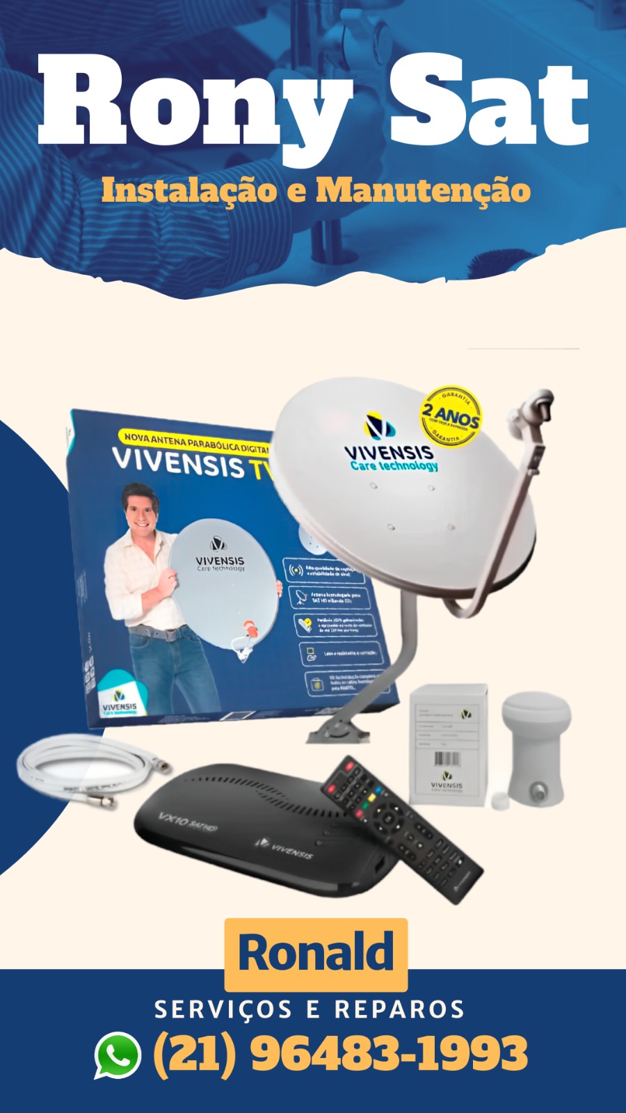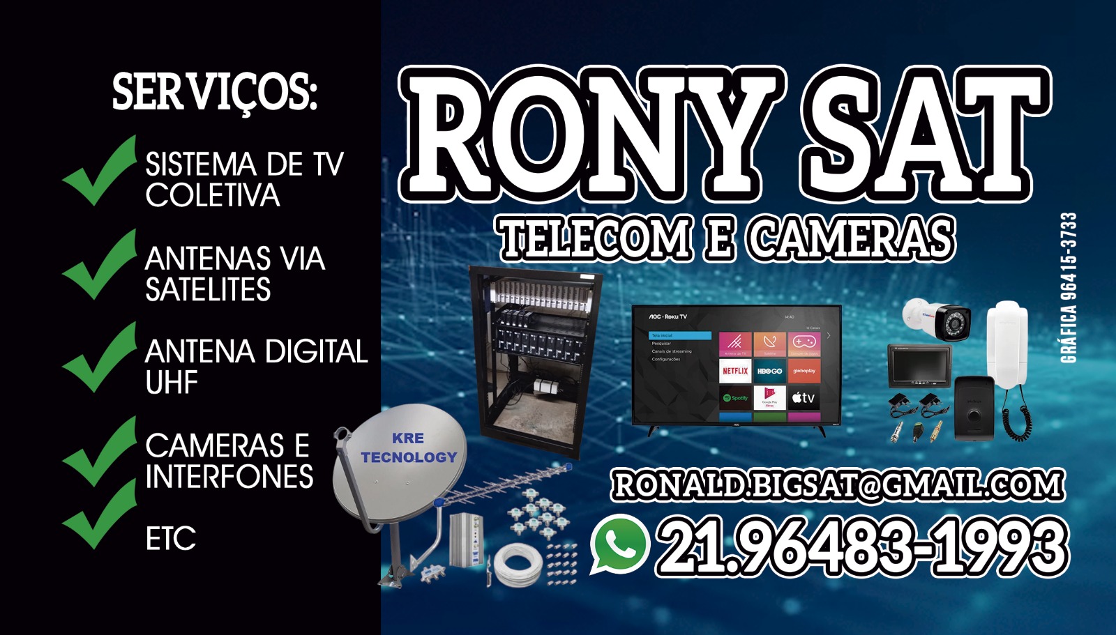 Bom dia meus serviços são de instalação de antena via satélite, antena coletiva em prédios e hospitais, Interfone, câmeras de monitoramento.