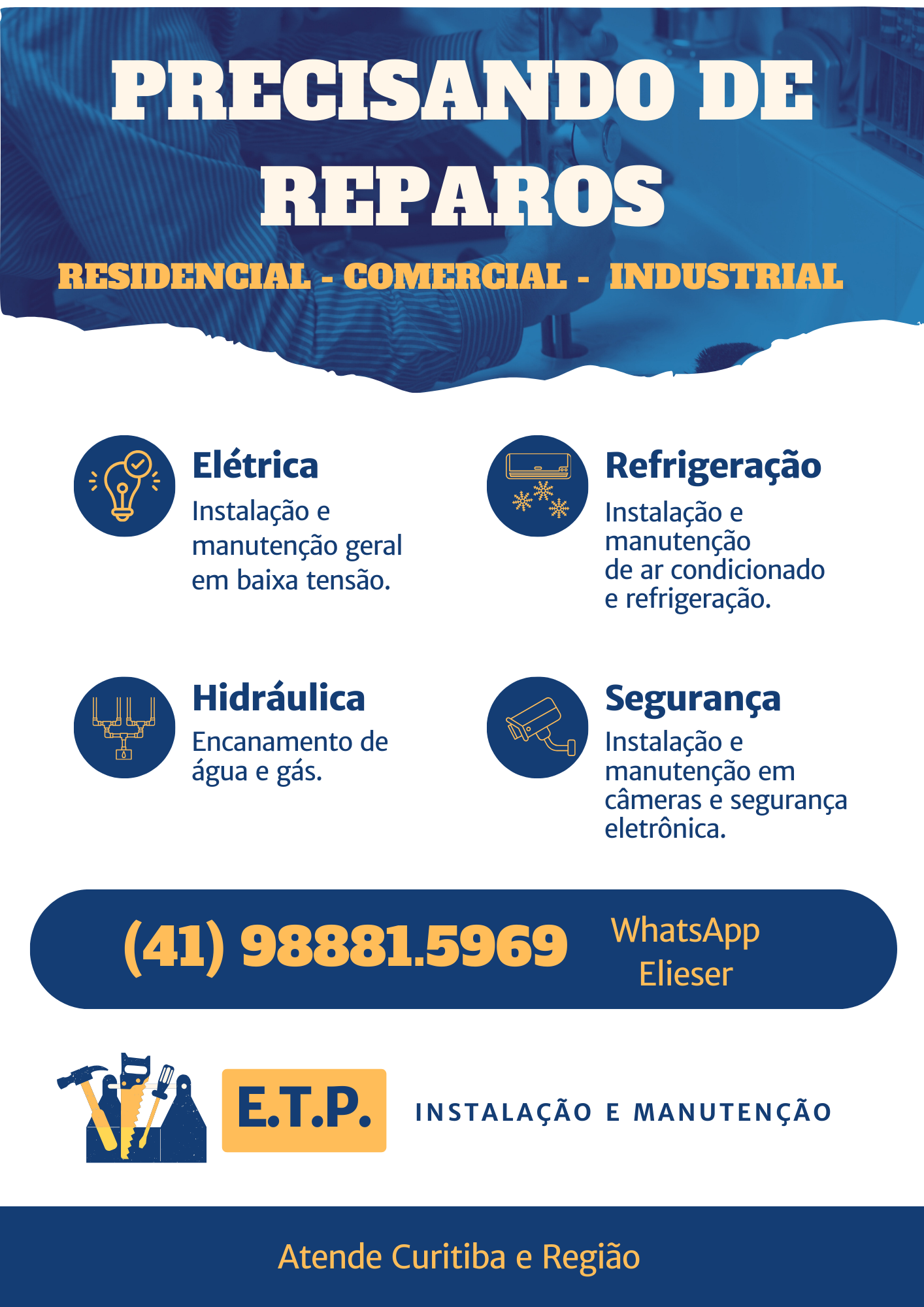 Serviços de Instalação e manutenção elétrica, consultoria e projetos Manutenção hidráulica predial Instalação e manutenção de ar condicionado Instalação e manutenção em CFTV e segurança eletronica